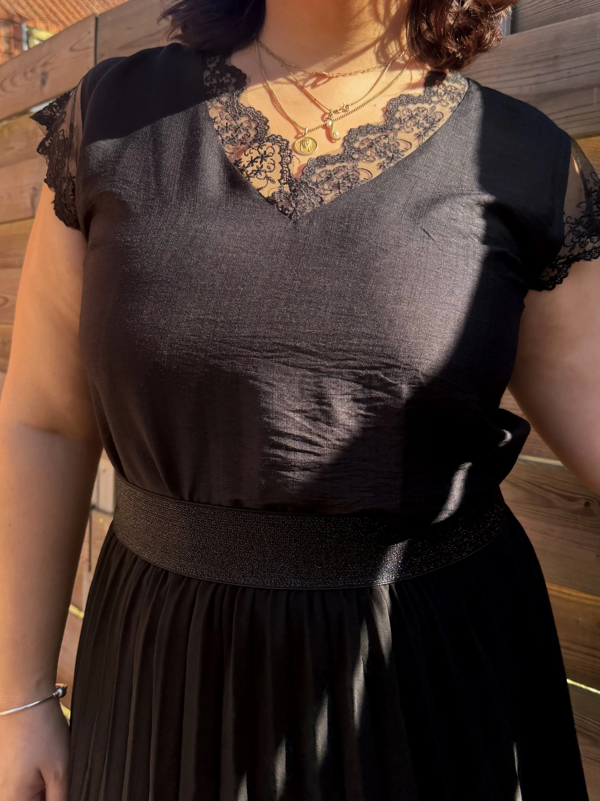 Son application étoile pailletée à l’avant attire subtilement la lumière, tandis que sa coupe ample et son col V en font un incontournable du vestiaire grande taille. Il se porte aussi bien avec un jean qu’un pantalon habillé ou une jupe fluide.